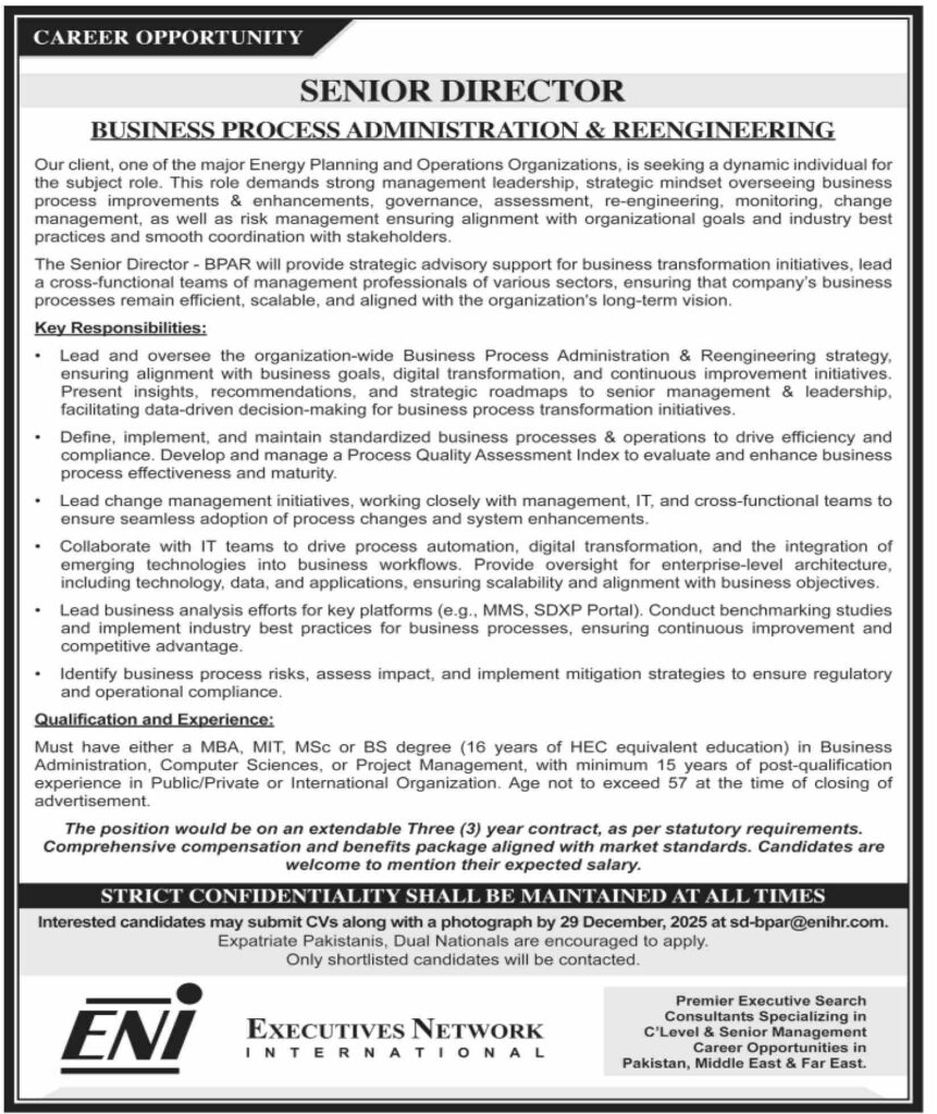 Both Male and Female candidates can apply for these Reengineering Jobs who have the Qualification: Must have either an MBA, MIT, MS,c or BS degree (16 years of HEC equivalent education) in Business Administration, Computer Sciences, or Project Management, with a minimum of 15 years of post-qualification experience in a Public/Private or International Organization. Age not to exceed 57 at the time of closing of advertisement, and many more experienced candidates should apply before 29 December 2025.