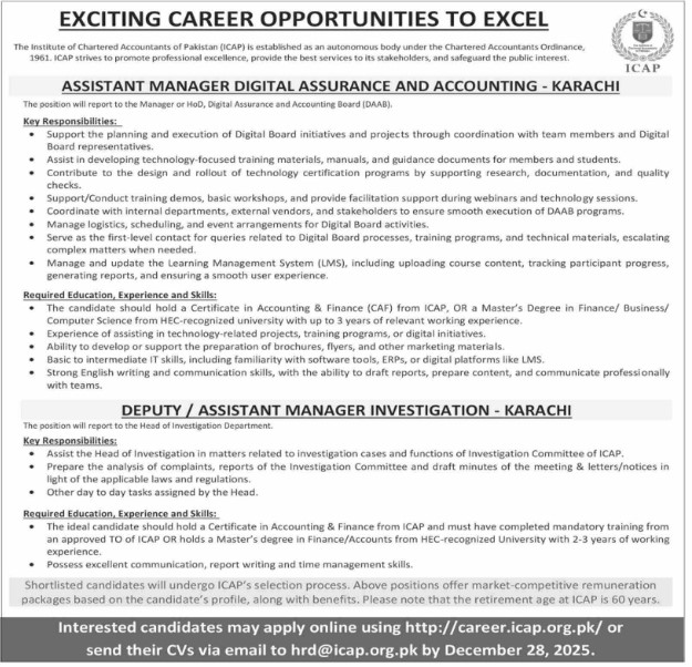 Both Male and Female candidates can apply for these Exciting Career Opportunities who have the Qualification: The candidate should hold a Certificate in Accounting & Finance (CAF) from ICAP, OR a Master’s Degree in Finance/ Business/ Computer Science from an HEC-recognized university with up to 3 years of relevant working experience. Experience in assisting with technology-related projects, training programs, or digital initiatives. Ability to develop or support the preparation of brochures, flyers, and other marketing materials. Basic to intermediate IT skills, including familiarity with software tools, ERPs, or digital platforms like LMS. Strong English writing and communication skills, with the ability to draft reports, prepare content, and communicate professionally with teams, and many more experienced candidates should apply before 28 December 2025.