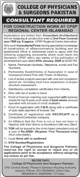 Both Male and Female candidates can apply for the College of Physicians Jobs who have the Qualification: Proof of financial standing, duly supported with balance sheets for the last 3 years, and the name of the bank where the account is operated, with the amount of credit available. Proof of registration with F.B.R., along with a certificate of up-to-date payment of Income Tax. Certificate of registration with PEC/PCATP as a Consultant/Contractor company. An Affidavit that the Firm is not or has not been in litigation with their clients or blacklisted with any Client.TOR will be issued to the short-listed consultant only for Rs. 5000/- (Rupees: Five Thousand only) (Non-refundable)., and many more experienced candidates should apply before 07 January 2026.