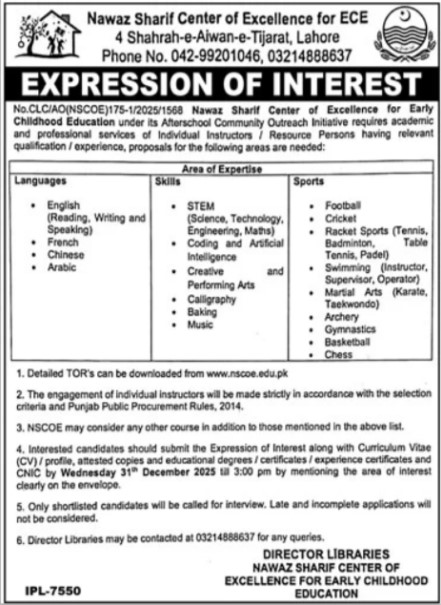 The engagement of individual instructors will be made strictly in accordance with the selection criteria and Punjab Public Procurement Rules, 2014. NSCOE may consider any other course in addition to those mentioned in the above list. Interested candidates should submit the Expression of Interest along with Curriculum Vitae (CV)/profile, attested copies, educational degrees/certificates/experience certificates, and CNIC by Wednesday, 31 December 2025, at 3:00 pm by mentioning the area of interest clearly on the envelope.