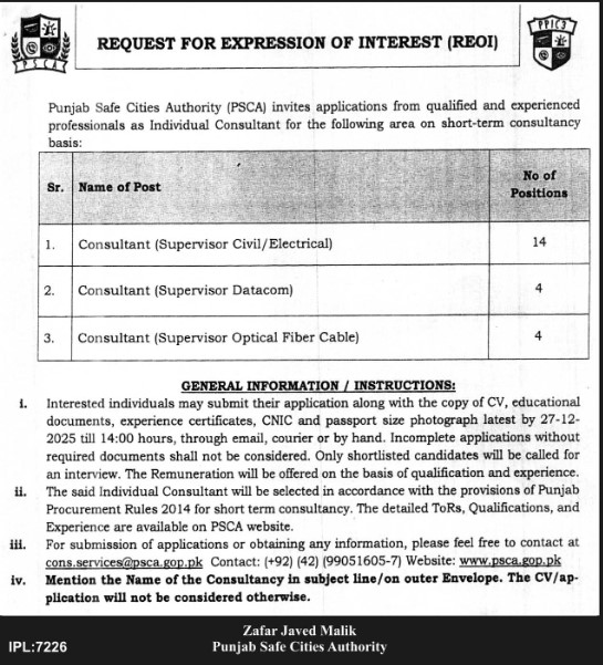 Interested individuals may submit their application along with a copy of their CV, educational documents, experience certificates, CNIC, and passport-size photograph by 27 12 2025 till 14:00 hours, through email, courier, or by hand. Incomplete applications without the required documents shall not be considered. Only shortlisted candidates will be called for an interview. The Remuneration will be offered on the basis of qualification and experience. The said Individual Consultant will be selected in accordance with the provisions of the Punjab Procurement Rules 2014 for short-term consultancy. The detailed ToRs, Qualifications, and Experience are available on the PSCA website.
